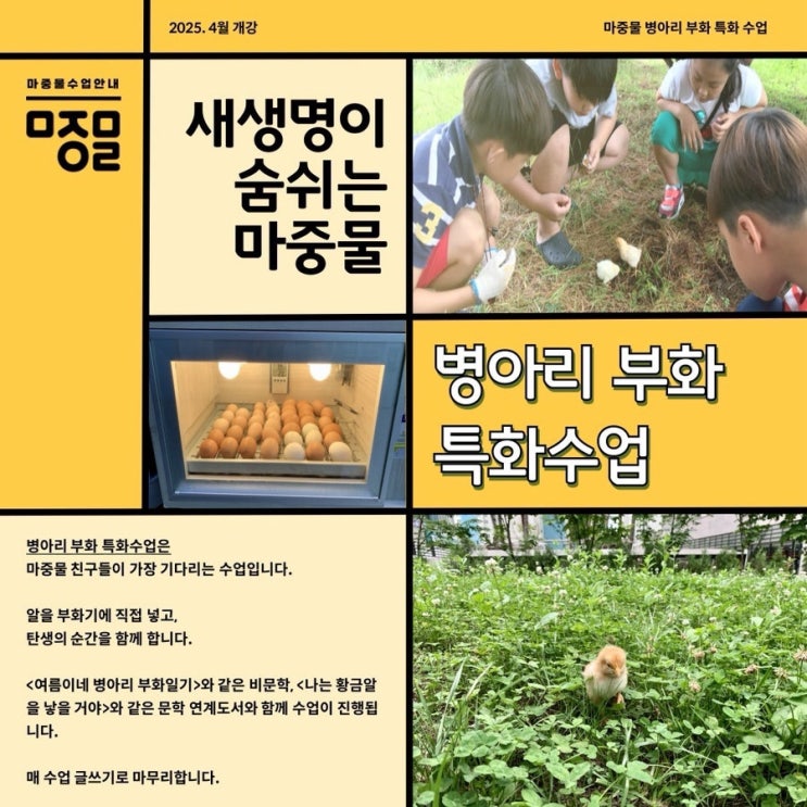 사랑이라는 감정과 마주하는 시간, 사랑이 자라는 수업, 병아리 부화 특화 수업 사랑이란 무엇일까요? 그 경계는 어디서부터 시작되고, 사랑하는 것과 사랑하지 않는 것 사이에서 우리는 어떤 감정과 행동의 변화를 경험하게 될까요? 마중물논술학원의 ‘병아리 부화 수업’은 바로 이 사랑이라는 감정과 마주해보는 특별한 시간입니다. 사랑과 책임감, 생명에 대한 이해는 책이나 말로만 가르칠 수 있는 것이 아닙니다. 마중물의 병아리 부화 수업은 바로 그 '마음을 여는 경험'을 통해 배우는 수업입니다. 보송보송한 솜털의 병아리를 보고 "키우고 싶다"고 말하는 아이들. 처음엔 귀여움에서 시작되지만, 알을 부화기에 넣....... <img src="https://blogthumb.pstatic.net/MjAyNjAzMDNfMTY5/MDAxNzcyNTE2OTMxNTM5.gdVSBNyKoS3QRzGD7NYzHBFtCwPOTyJCElJpyFSboLcg.GlIEOPiOpDQAClGXGTWvUwiL77LNd6y1bvHmtmC0JmIg.JPEG/IMG%A3%DF0640.JPG?type=s3" />