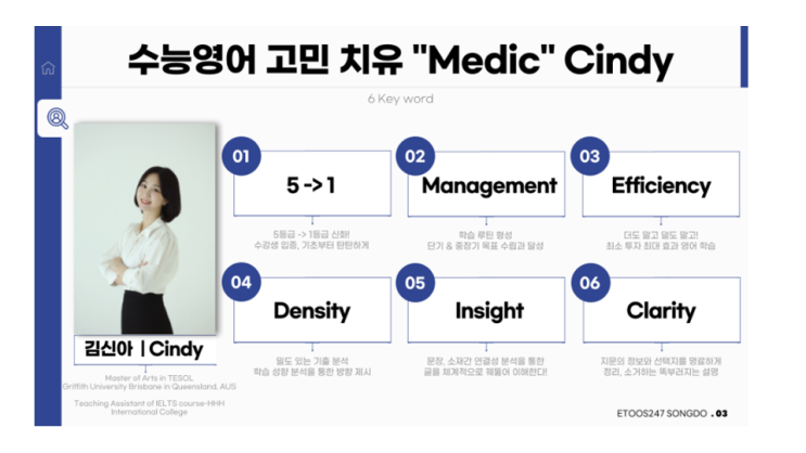 주제 : 급변하는 입시 판도, 지금 필요한 합격 전략의 모든 것 세부 주제 1. 내신만으로는 부족한 시대 - '급변하는 입시 판도의 핵심 트렌드' 2. 실제 점수로 이어지는 생기부 - '합격을 만드는 설계 전략' 3. 입시 평가의 숨은 무기 - '대치동 실전 노하우로 가산점 잡기' 4. 송도 입시 평가 특징 - '고교별 입시 유불리 분석 및 맞춤 전략' 연사 : 김민성 대표 약력 현) 댓츠원 컨설팅랩/스터디랩 대표 전) 대치IDA 입시연구소 소장 전) 대치명인학원 입시컨설턴트 YouTube '댓츠원’ - 채널A ‘티처스 시즌2’ 출연 - JTBC뉴스 '상암동 클라스’ 출연 - EBS뉴스 '대입전략 특강’ 출.......