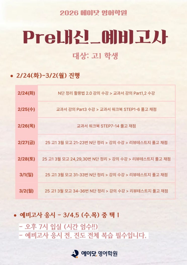 안녕하세요 에이닷 영어학원 인천송도지점입니다. 새 학년을 앞두고 가장 중요한 시기인 지금, 고1 첫 내신을 어떻게 준비하느냐에 따라 1년의 흐름이 달라집니다. 에이닷 영어학원 인천송도지점에서는 고1 학생들을 대상으로 Pre내신 예비고사 프로그램을 진행합니다! 본격적인 학교 내신에 들어가기 전, 개념 정리부터 실전 대비까지 체계적으로 준비하는 과정입니다. Pre내신 진행 일정 2/24(화) ~ 3/2(월) 예비고사 응시 안내 3/4, 3/5 (수·목 중 택 1) 오후 7시 입실 (시간 엄수) 예비고사 응시 전, 진도 전체 복습은 필수입니다. ✏️ 왜 Pre내신이 중요한가요? 고1 첫 시험은 단순한 시험이 아니라 내....... <img src="https://blogthumb.pstatic.net/MjAyNjAyMjZfMTUy/MDAxNzcyMDk4Mzc3MDAx.-rL3UHfurIbHJPFfKFcKzBCE0gfV32XLLtGjM7Bl9S4g.JWhYTQrsu5Qeevlahcnu4KRSli4zaOnaBkrkLSOZXr8g.JPEG/26_%B0%ED1_%C7%C1%B8%AE%B3%BB%BD%C5.jpg?type=s3" />