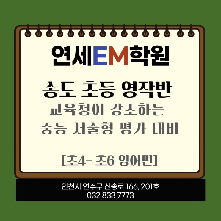 송도 초등 영작 / 송도 초등 문법 송도 초등 영어 / 송도 초등부 영어 서술형 연수구 초등학생 영어학원 / 송도 초등학교 문법학원 소개 : 송도 초등 영작으로 중등 서술형 완전 정복 안내 : 송도 초등학생 영어 : 초4- 초6 3월 대개강 부제 : 제대로 배우는 송도 영작반 안내 안녕하세요. 연세EM학원의 이엠지기 인사드립니다. 벌써 2월말이 되더니 곧 개학이 시작되는 3월의 봄느낌이 낮에 조금씩 느껴지고 있습니다. 3월 개학에 앞서서 초등 4학년 ~ 6학년 자녀를 두고 계신 분이라면 미리 알고 있어야 하는 한국 영어교육의 추세를 다시한번 말씀드리고자합니다. 중등 영어 교육의 추세 : 교육청 자료 참고 올해 경기도 및 인천 교육청 중학....... <img src="https://blogthumb.pstatic.net/MjAyNjAyMjZfODMg/MDAxNzcyMDg5NDgzNTU1.8MCxHp65wgI_0DusDM6_Eme4bkz1boOp0AKHjiKLc2og.MpQGFf34jiXte8hh7KEzM-HYCkSjjKtm5zB9wysx4ocg.JPEG/%C3%CA%B5%EE_%BF%B5%BE%EE.jpg?type=s3" />