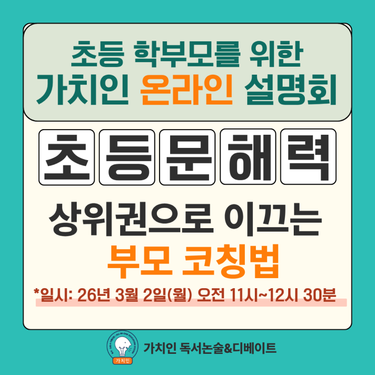 인천 송도 초등 학부모를 위한 <초등 문해력 상위권으로 이끄는 부모 코칭법> 온라인 설명회/가치인 독서논술&디베이트 송도점 신학기 설명회