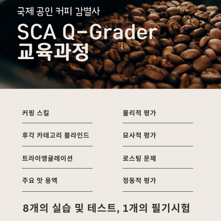 국제 공인 커피 감별사 SCA Q-Grader 과정 모집 커피를 좋아하는 단계에서, 이제는 품질을 판별하는 단계로. AST이자 Q Instructor가 직접 지도하는 국제 커피 평가 전문가 과정입니다. 단순한 커핑 스킬이 아닌 ✔ 커피의 향미를 구조적으로 분석하고 ✔ 100점 스케일로 정량화하며 ✔ 품질과 시장 가치를 종합적으로 판단하는 능력 “감각”을 “기준”으로 만드는 시간입니다. 3월 7일 ~ 3월 22일 (토·일 / 총 6회) ⏰ 09:30 – 18:30 (1일 8시간 집중 과정) 수업료 150만원(인증비별도) 총 8개의 실습 및 테스트 + 1개의 필기시험 ✔ 커핑 스킬 ✔ 후각 카테고리 블라인드 ✔ 트라이앵귤레이션 ✔ 주요 맛 용액 ✔ 물리적 평가 ✔....... <img src="https://blogthumb.pstatic.net/MjAyNjAyMjBfOTAg/MDAxNzcxNTc3ODgxMjg2.fixujFyHsKojOU6hN-a0t2OoKRKeM5GjPsSEScqqPXwg.F-hcw606DyHM73IgfEcHO42gAS46_aT7kcBTbo18IB4g.PNG/%B8%B6%C0%CC%BD%BA%C5%CD%C4%BF%C7%C7%B9%D9%B8%AE%BD%BA%C5%B8%C0%FC%B9%AE%C7%D0%BF%F8.png?type=s3" />