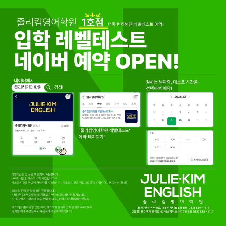 이제 레벨테스트 네이버 예약이 가능합니다. 이 최첨단 시대에 저희 예약시스템이 좀 구식이였죠? 아뿔싸. 그래서 이제는 네이버 예약이 가능해졌으니 많은 관심 부탁드립니다 :-) <img src="https://blogthumb.pstatic.net/MjAyNTExMjdfMjIy/MDAxNzY0MjM4MjczOTQ1.eru333Oof2dBI3YvMwe8Nx9d2biipAq3OMyG0MPXtUkg.klwhQ9WY4vMqsrVimCZq4L6TBq-gS0dA5VEhSgIpaDsg.JPEG/IMG%A3%DF3136.JPG?type=s3" />