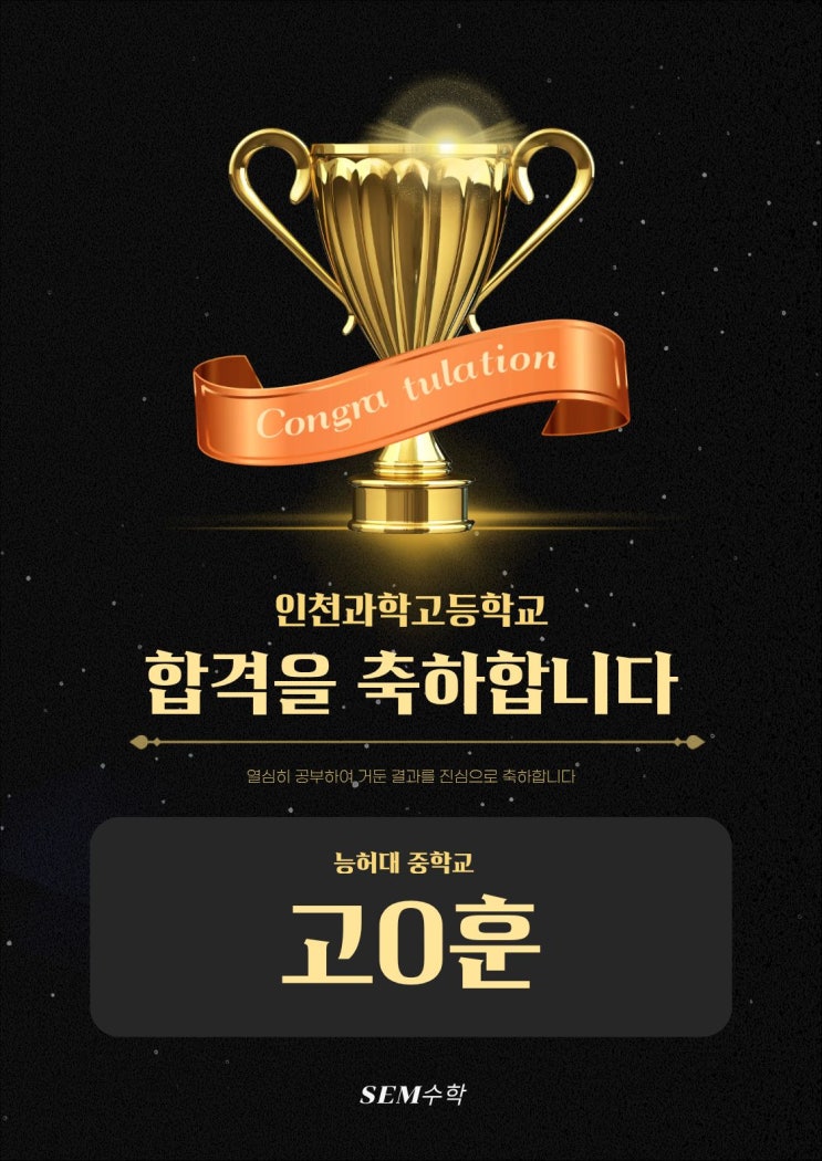 안녕하세요! 에스이엠 수학입니다~ 오늘은 학원에 정말 기분 좋은 소식이 있어 급하게 글을 올립니다! 우리 에스이엠에서 열심히 공부하던 친구가 이번 입시에서 놀라운 성과를 거두었습니다. 2025학년도 인천 과학고등학교 합격!! (에스이엠 수학 고○훈 학생) 정말 자랑스럽고 대견합니다! 치열한 경쟁 속에서도 흔들리지 않고 묵묵히 해낸 우리 학생에게 큰 박수를 보냅니다. 이번 인천 과학고 합격은 학생의 피나는 노력과 더불어 에스이엠이 항상 강조하던 두 가지 원칙이 틀리지 않았음을 증명하는 결과라 더 뜻깊습니다. 첫째, 흔들리지 않는 '기초 연산'의 힘! 어려운 심화 문제일수록 가장 기초....... <img src="https://blogthumb.pstatic.net/MjAyNTEyMDVfMTEx/MDAxNzY0OTQyMDc4Mzcx.7gufRXktYkPKmsnwY5lmx5Hqu0HZhbY5UiQXq0PEXO0g.RDRBUwbGBfcrnl4OZ9tdhrqsYJBarFVCKP3HRppDl50g.JPEG/1._%C7%D5%B0%DD%C3%E0%C7%CF%B1%DB.jpg?type=s3" />