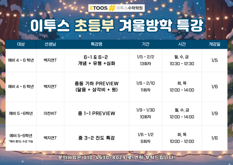 안녕하세요 이투스 수학학원입니다. 겨울방학 특강 안내드립니다. 추가 문의사항이나 궁금하신 점은 010-4630-8029 으로 연락 부탁드립니다!! <img src="https://blogthumb.pstatic.net/MjAyNTEyMjRfMTY4/MDAxNzY2NTYyMzAzNTk0.jrhEYN5zSk6jIGGTkYLqLySpYka_TiP-NIcgPBV72Bcg.w05dwNitul50W_HXgOCRK4xHi5d9IiWuWFyUbK0nQ2Eg.PNG/001.png?type=s3" />