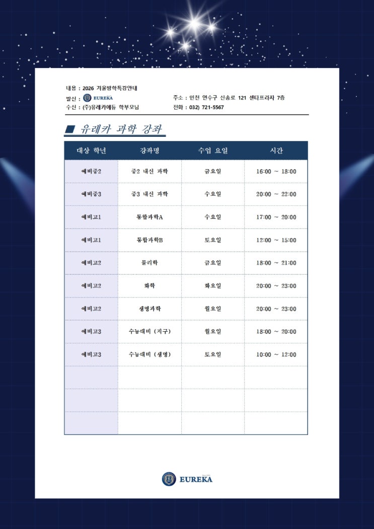 안녕하세요. 이은국어논술학원입니다. 2026년 1월 중등부 시간표 안내입니다. 중등부 시간표 중등부 시간표 : 중1 (신규반/ 2026.1.3 개강) 강사 : 이종근 원장 중1반 수업 요청이 많아 저녁 7시 수업을 추가 개설하였습니다. 현재 수강신청이 가능하니 등록을 원하시는 분은 학원으로 문의주시기 바랍니다. ☎ 문의전화 : 032-834-2299(이은국어) ▼중1 프로그램 소개 ▼ 중등부 시간표 : 중2 강사 : 이종근 원장 ▼중2 프로그램 소개 ▼ 중등부 시간표 : 중3 ▼ 중3프로그램 소개 ▼ ☎ 문의전화 : 032-834-2299(이은국어) ★ 학원/교습소 정식 명칭 : 이은국어학원 인천 연수구 해돋이로 172번길38, 하늘빌딩 6층 (전화 032-834-2299) ★ 학원.......