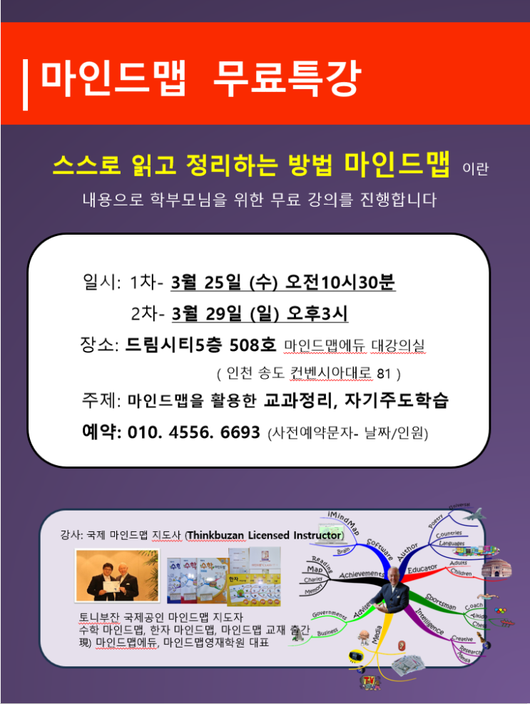 마인드맵에 대한 무료 강의를 진행합니다. 마인드맵에 대한 기본 정보와 마인드맵을 활용한 스스로 읽고, 이해하고, 정리하는 자기주도학습에 관한 내용과 자기주도학습에 입시에 미치는 영향 등에 관한 내용으로 무료 강의를 진행합니다. 일자: 1차- 3월25일 수요일 오전 10시30분 2차- 3월 29일 일요일 오후3시 (1시간30- 2시간) 대상: 누구나 상관 없습니다 장소 : 인천시 연수구 송도동 컨벤시아대로 81 (드림시티 ) 5층 508호 마인드맵에듀 대강의실 예약: 010-4556-6693 (사전 문자 예약 - 날자, 인원) 소규모 인원으로 진행 예정입니다. <img src="https://blogthumb.pstatic.net/MjAyNjAzMTJfNTkg/MDAxNzczMjk2MTkzMDgw.DZw-asGv-TYszqsTfltqOujClaa6iThB5nsQ9miEL6Yg.aE0skRfOhJMmVgqMqHlroZQpY3Wyu8lAsOmVkrNuaRgg.PNG/20260312_144921.png?type=s3" />