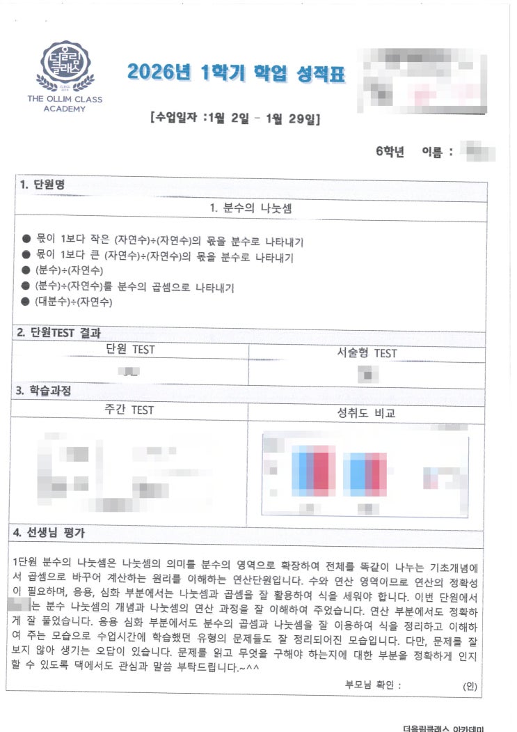 [서창동수학학원] 2026년 1학기 ♥초등 6학년 1단원 학업성적표♥