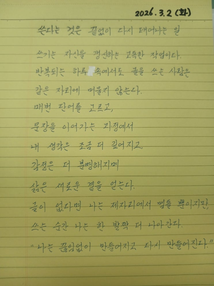 “네가 성장해야 아이들도 성장해.” 언니의 그 말이 오늘 나를 책상 앞으로 앉게 했습니다. 좋은 사람이 곁에 있다는 건 참 큰 복입니다. 필사 1일차... 꾸준히 해 보는거야^^ 쓴다는 것은 끝없이 다시 태어나는 일 쓰기는 자신을 갱신하는 고독한 작업이다. 반복되는 하루 속에서도 글을 쓰는 사람은 같은 자리에 머물지 않는다. 매번 단어를 고르고, 문장을 이어가는 과정에서 내 생각은 조금 더 깊어지고, 감정은 더 분명해지며, 삶은 새로운 결을 얻는다. 글이 없다면 나는 제자리에서 맴돌 뿐이지만, 쓰는 순간 나는 한 발짝 더 나아간다. “나는 끊임없이 만들어지고 다시 만들어진다.” <img src="https://blogthumb.pstatic.net/MjAyNjAzMDJfMjI0/MDAxNzcyNDI3Njc0Njc2.2vMoZ7OSS5GLeF2Sv6VtW-WUSZ_eFRiG8GoXOy0pcPkg.FOgFXZ4TvCTEY40VJNJnvTEKYEYJPBQqrvPfEG3u2vMg.JPEG/900%A3%DF20260302%A3%DF135327.jpg?type=s3" />