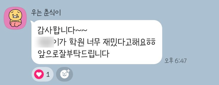 안녕하세요~ 이루다영수학원입니다. 저희 이루다영수학원을 믿고 맡겨주시는 학부모님들께 항상 감사드립니다. 최근 학부모님들께서 보내주신 따뜻한 메시지들을 보며 저희도 큰 힘을 얻고 있어요. 짧은 메시지 하나하나에 아이들의 변화와 성장, 그리고 학부모님의 신뢰가 담겨 있어서 더욱 소중합니다. 아래는 최근에 받은 학부모님들의 실제 메시지 내용입니다. . 이루다영수학원은 ‘재미 + 결과’ 둘 다 잡는 학습을 목표로 합니다! 아이들이 스스로 배우고 싶은 마음이 생기도록 흥미를 잃지 않는 수업, 성취감을 느끼는 피드백, 맞춤 지도 이 세 가지를 중점으로 수업을 진행하고 있습니다. 학부모님들의 메시지는 저희에게 가장 큰 동기....... <img src="https://blogthumb.pstatic.net/MjAyNTExMzBfNjYg/MDAxNzY0NDMwMzkzNzc1.I5GEKM6S_vPumx92JjAL2EZzis2hCaliHfwPIpFX3_Yg.33eXvZauFCbARZHkKYtkvTmfBN5kw69rSLLhZvNAoQUg.JPEG/KakaoTalk_20251130_002438742_03.jpg?type=s3" />