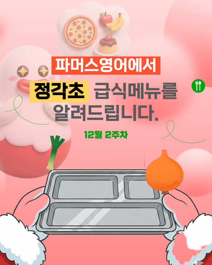 정각초 12월 2주차 급식메뉴를 파머스영어 구월캠퍼스에서 알려드립니다. | 구월동 영어학원, 상아초, 석천초, 간석초