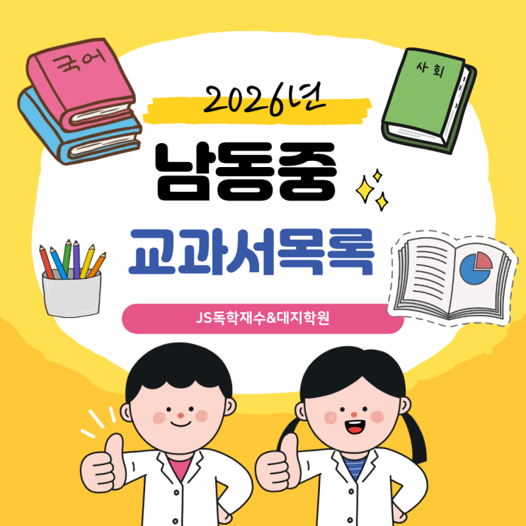 2026학년도 남동중 교과서 목록 총정리 (1·2·3학년) 안녕하세요, JS독학재수&대지학원입니다 새로운 학년이 시작되는 시점에서 학생과 학부모님들이 가장 먼저 챙겨야 할 필수 준비물은 단연 교과서입니다. "올해 우리 아이는 어떤 출판사의 교과서를 배우게 될까?", "선행 학습이나 참고서 준비는 어떻게 시작해야 할까?" 등 새 학기를 앞두고 여러 가지 고민이 많으실 텐데요. 이러한 궁금증을 해소해 드리고자, 2026학년도 남동중학교 1, 2, 3학년 교과서 목록을 학년별, 과목별로 한눈에 보기 쉽게 정리해 보았습니다. 새 학기 학습 계획을 세우는 데 큰 도움이 되기를 바랍니다. 남동중학교 교과서 목록 확인....... <img src="https://blogthumb.pstatic.net/MjAyNjAzMDlfMTcw/MDAxNzczMDQyMTYyMzEz.d2_9nf8o-aN5nP0CU1UxqbFh86cAAfWMo7rlOov5FP4g.jlRQqE3OBVEk02Dbq4yL8t5b8TVNFYcVkON6ar33W38g.PNG/%C1%A6%B8%F1%C0%BB_%C0%D4%B7%C2%C7%D8%C1%D6%BC%BC%BF%E4._%2814%29.png?type=s3" />