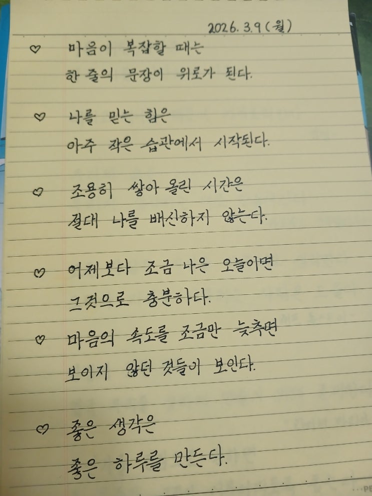 바쁜 하루 속에서도 잠깐 멈추는 시간이 필요하다는 걸 요즘 새삼 느끼고 있습니다. 좋은 문장을 따라 쓰다 보면 신기하게도 마음도 함께 정리됩니다. 오늘도 잠시 쉼표 하나 찍어 봅니다. 좋은 문장을 천천히 따라 쓰는 시간, 생각보다 마음이 편안해집니다. 마음이 바쁜 날이라면 여러분도 한 줄 적어보셔도 좋겠습니다. <img src="https://blogthumb.pstatic.net/MjAyNjAzMDlfNzUg/MDAxNzczMDIzODAzMTYy.mhlAtTS9BXUfEYulUVQ20CfLjKtQeNpmYeYrGKRaxyEg.mR15lBkhbL59WQtbN-uy_xq-z70IK11KgPO8TWGbz5Ag.JPEG/900%A3%DF20260309%A3%DF061724.jpg?type=s3" />