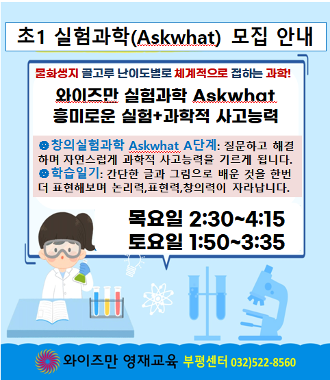안녕하세요~와이즈만 부평센터입니다.^^ 본격적으로 학교생활이 시작되는 3월이 다가오네요. 원활한 학교생활을 시작하기 위해 필요한 것은 역시 자신감! 우리 초1 친구들을 위한 와이즈만 부평센터의 수학,과학 수업을 만나보세요. 경험하지 못한 흥미로운 주제들로 집중력 향상, 다양한 의견에 대한 긍정적인 수용으로 창의력 향상, 친구와 함께 생각을 나누며 문제를 해결하면서 논리력 향상, 배운 내용을 짧은 글과 그림으로 나타내 보며 표현력 향상! 와이즈만 수업과 함께 학교에서의 자신감도 한층 자라날 것입니다. 재미있는 주제들로 즐기며 문제 해결! 와이즈만 초등 사고력수학과 실험과학이 지향하는 목표입니다. 물화생지 골고루 난....... <img src="https://blogthumb.pstatic.net/MjAyNjAyMjNfMjAy/MDAxNzcxODQ2NTE2MDYw.ToyTg6sOlcP0iS8X8qq4nu8npSoFP84xtMquXeTOdXEg.QcxIMJRcB6zundI7u52iAJctXpxYizoHyfoSZZp_bVYg.PNG/image.png?type=s3" />