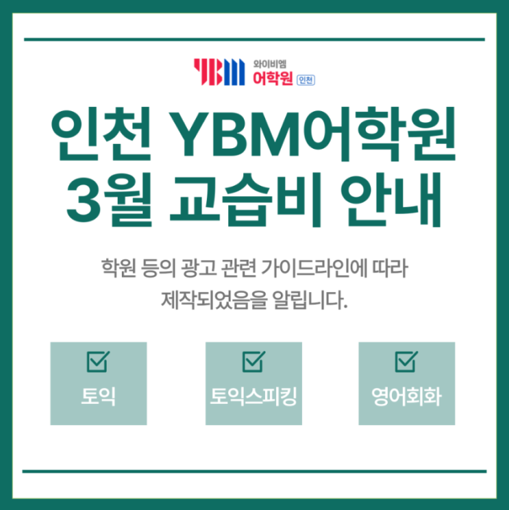 안녕하세요. YBM인천어학원입니다. 학원법 관련 블로그 의무 표시사항을 게시합니다. 교습과목 및 교습비는 아래 이미지와 같습니다. <img src="https://blogthumb.pstatic.net/MjAyNjAzMDNfNCAg/MDAxNzcyNTE1NTY5NzU3.3kPXoD9VasULpg8q88NmOjXsQXWmzwHdTIpiY14UvD0g.BhAHSGhyH9U4Abp89GMaRLrygAX1t5r4bfXCGT5FmhYg.PNG/image.png?type=s3" />