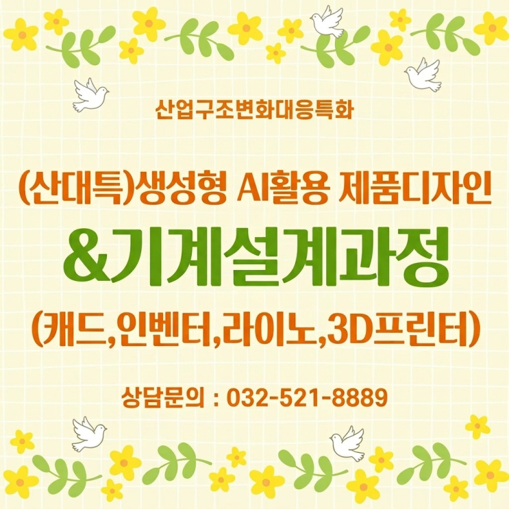 안녕하세요 인천제품디자인캐드학원 입니다 :) 우리 오늘 같이 살펴볼 과정은요? (산대특)생성형 AI활용 제품디자인&기계설계과정(캐드,인벤터,라이노,3D프린터) 우리 과정을 들어야하는 분들은? 제품디자인과 기계설계 분야 취업을 하고 싶은 분 2D 오토캐드, 3D 캐드, 모델링 기초부터 배우려는 분 비전공자이지만 기계, 제품디자인 분야 취업하고 싶은 분 AI 활용 부분도 같이 배우고 싶은 분 우리 과정은 어떤 걸 배우게 될까요? 먼저는 오토캐드 2D 설계 도면 기초와 인벤터를 통해 3D 설계에 대한 실무를 훈련하고 라이노를 통해 제품 모델링을 직접 다뤄보고 이 기술들을 통해서 포폴 제작을 구성하게 되는 커리....... <img src="https://blogthumb.pstatic.net/MjAyNjAzMjBfMjQ5/MDAxNzczOTk2ODk1MjQy.IDCTmgWlSrfwZgPRDGdVqNgoC6zBwYx8ad40A8bqlscg.Q-zBxMgliouLGvE453fu0QR6AlTE7nL6MntJiHnT9Hsg.PNG/%B1%E2%B0%E8%BC%B3%B0%E8.png?type=s3" />