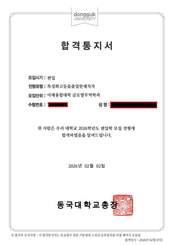 안녕하세요? 인천, 부천, 부평, 송도, 청라, 김포, 검단 김영편입 부평 캠퍼스 입니다. 오늘은 특성화고 졸업 재직자 전형으로 7개 대학에 합격한 학생의 합격수기를 올려 봅니다. 꾸준히 노력하여 목표를 이룬 OOO 학생의 미래를 응원합니다. 특성화고 졸업 재직자 전형 7개대학 합격 특성화고 졸업 재직자 전형 편입 합격수기 – 6개월 준비로 7개 대학 합격, 그리고 동국대학교 글로벌무역학과 진학까지 안녕하세요. 저는 특성화고를 졸업한 후 재직자 전형을 통해 편입을 준비하게 된 학생입니다. 고등학교 졸업 이후 바로 대학에 진학하지 않고 사회생활을 시작했지만, 시간이 지날수록 학력에 대한 아쉬움과 진로에 대한 고민이 커졌습니다....... <img src="https://blogthumb.pstatic.net/MjAyNjAyMjRfNDYg/MDAxNzcxOTI0NzM0MDA0.ulX1zf2E4YZPMXowAhLsPxpvrlcSnU41nZF5bMQvaxMg.SAZaDUNf6MG9AlX2hspy1-TkYU6dgBbd728hM2flGV0g.PNG/image.png?type=s3" />