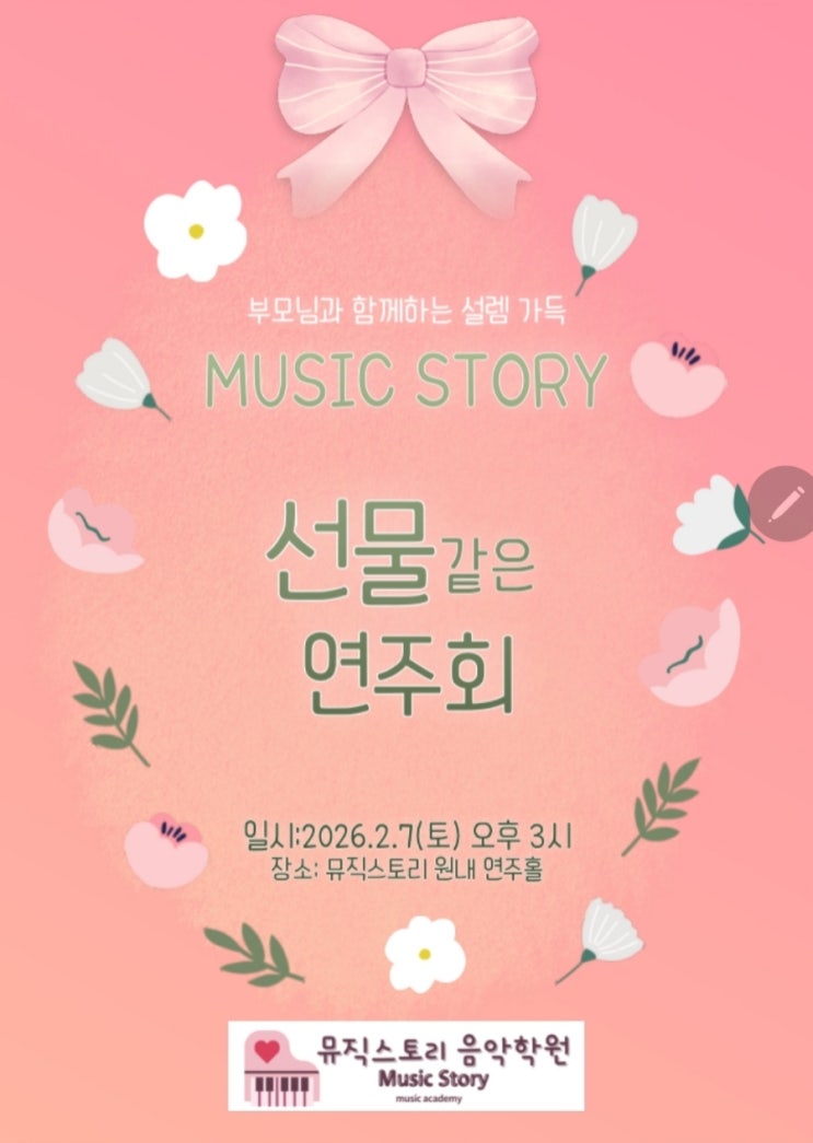 안녕하세요.뮤스쌤입니다 지난 2026년 2월 7일 토요일~ 뮤직스토리의 든든한 후원자이신 부모님들을 모시고 함께한 선물 같은 연주회가 드뎌 개최되었습니다. 우리 친구들 몇개월을 그 날을 위해 열심히 달려왔는데 참 따뜻하고 의미 있는 시간이었습니다 . 앞자리에 앉으시려 시간보다 더 일찍 오신 우리 뮤스 부모님들~너무 감사했어요. 학원에서 정성껏 준비한 다과를 함께 나누시며 무대를 기다려 주신 부모님들, 내빈석을 가득 채워 아이들을 응원해 주신 그 모습만으로도 공간은 이미 충분히 따뜻했습니다. 한 분 한 분의 눈빛과 박수가 아이들에게 큰 힘이 되었을 것 같아요, 이번 무대는 아이들 한 명 한 명....... <img src="https://blogthumb.pstatic.net/MjAyNjAyMTFfMTM5/MDAxNzcwNzg0MzQ5Njcy.WJ5hAB7ZDLfGAojfSE5cp7e9vCpkN86OKj3d9ONXWVgg.gKVGgeS2DVl_CTRr_QcQW8n6xTMMnVCUX394UQ_pxxgg.JPEG/900%A3%DFScreenshot%A3%DF20260127%A3%DF082902%A3%DFKakaoTalk.jpg?type=s3" />