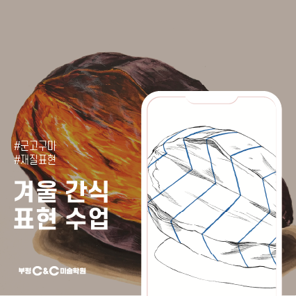 안녕하세요! 부평 씨앤씨미술학원 유니쿤 소연T입니다. 오늘은 겨울이 거의 끝나가기 전에…! 아이들과 함께 군고구마 관찰 드로잉을 진행한 수업을 소개해보려고 해요. 붕어빵에 이어 이번엔 군고구마로 질감 표현을 연습해봤는데요, 겉껍질의 까슬함과 속살의 촉촉함을 얼마나 다르게 표현할 수 있는지가 포인트였어요! 예시작 채색 전에 스케치에서는 그리드를 활용해 전체 비례와 덩어리를 먼저 안정적으로 잡았습니다. 군고구마는 형태가 단순해 보여도 윗면·옆면·속이 갈라지는 단면 구조가 다 달라서, 큰 실루엣을 정확히 잡는 게 중요해요. 속이 들어가는 부분의 각도와 깊이를 먼저 정리해두면 채색할 때 명암이 훨씬 자연스....... <img src="https://blogthumb.pstatic.net/MjAyNjAyMTNfODMg/MDAxNzcwOTY2MDAyMTgx.yx--ZVKLGZTS1ObWONnT6idzhnotDH-PryhyoIf1RRQg.6wyPY1v-G6eKUTYF1iXaIPqVqIxRex47PAJvdkReU-0g.PNG/%B4%EB%C1%F6_21.png?type=s3" />