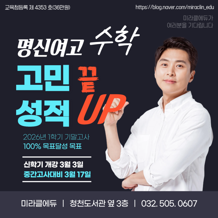 안녕하세요? 부평에서 가장 핫한 고등수학 전문학원 미라클에듀입니다. 지난 번 약속드린 바와 같이 부평구에 있는 고등학교의 수학 시험 경향 분석 글을 포스팅하겠습니다 수학시험을 분석하기 전에 명신여고를 간단히 소개하겠습니다. 1971년에 명신여자상업고등학교로 개교하고 1983년 명신여자고등학교로 개편하여 지금에 이르고 있습니다. 인천외국어고등학교와 같은 재단이고 같은 캠퍼스에서 공부하고 길 건너 세일고등학교가 있어서 경쟁의식을 갖고 있는 것 같고 면학분위기도 잘 잡혀있는 학교라고 설명드릴 수 있습니다.... 그래서인지 우수한 학생들의 지원이 많아 내신 따기도 힘든 학교라고 알려져 있습니다. 우수한 학생이 많이 지....... <img src="https://blogthumb.pstatic.net/MjAyNjAyMjVfMjU2/MDAxNzcyMDA2MTQyNjYy.I_DopBx-qBK2HZ1N_QyNRxM3VTlAGd4WiHFs_oO3G7og.UJaUB7Hjc3CjSnipl2vI57yVAad5hcEV_Oo0DGCojDUg.PNG/%C1%A6%B8%F1%C0%BB_%C0%D4%B7%C2%C7%D8%C1%D6%BC%BC%BF%E4._-_2026-02-25T162302.195.png?type=s3" />