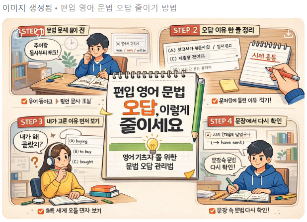 안녕하세요? 인천 부천 부평 대표 편입학원 김영편입 부평 캠퍼스 입니다. 편입 공부를 하고 있는 수험생 분들이 가장 먼저 부딪치는 문법공부, 오늘은 문법 문제 오답을 줄이는 방법을 포스팅해보려고 합니다. 아래글 참고해서 문법점수 올리는데 도움되기 바랍니다. 편입 영어 문법 문제, 오답 이렇게 줄이세요 영어 기초자를 위한 문법 오답 관리법 편입 영어 문법 문제를 풀다 보면 이런 경험을 많이 합니다. “공부한 문법인데 또 틀렸어요.” “알고 있는 내용인데 시험에선 헷갈려요.” “문법 문제만 가면 점수가 불안해요.” 이유는 간단합니다. 문법 오답은 실력 부족보다 ‘풀이 습관’ 문제인 경우가 훨씬 많기 때문입니다. ❌....... <img src="https://blogthumb.pstatic.net/MjAyNjAxMjdfMTMx/MDAxNzY5NDg5MTk3ODY3.ghnMaQY6FmJ5m6j5fyudAhOtlNU3dhOr1qBhHDwJMlwg.kLvbBhvpkM-R8RZQDJ4vs7yw50XjxIyL-6dkq5rmO_0g.PNG/image.png?type=s3" />