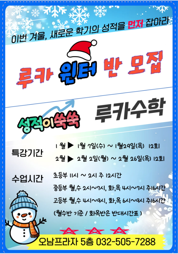 안녕하세요~~ 긴 겨울방학 루카에서 "루카윈터반"을 모집합니다. 겨울방학동안 하루 3시간만 집중해서 공부한다면 얼마나 좋을까? 하루 5시간만 집중해서 공부한다면 얼마나 좋을까? ◆ 초등 윈터반 월~목 하루 3시간씩 ◆ 중/고등 윈터반 월, 수반 - 월수는 5시간, 화목 3시간 화, 목반 - 화목은 5시간, 월수는 3시간 신학기 대비를 위한 <일대일 맞춤 특강프로그램>으로 준비하세요 복습이 필요하세요? 선행이 필요하세요? 틀린 문제 개인별 첨삭지도가 필요하세요? 루카윈터반에서 해결하세요 ◆ 루카윈터반 원비 초등 윈터반 → 35만원 (주 12시간 / 12회 특강수업) 중등 윈터반 → 45만원 (주 16시간 / 12회 특강수업) 고등....... <img src="https://blogthumb.pstatic.net/MjAyNTEyMzBfMjkx/MDAxNzY3MDgzMjU3NjM3.oNF-Tjqfmsjw3a_ngbAa-4hmgg1qqnby1PPIIIz6bKog.dMiqPrHDYhCddUXE4sQttNLhX83pmi40o9fcScnR9qUg.PNG/25%B0%DC%BF%EF%BD%C3%B0%A3%C7%A5-2.png?type=s3" />