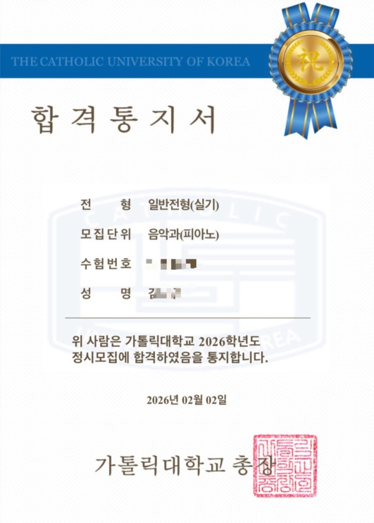 2026학년도 카톨릭대학교 피아노과 * 정시 최초합격 * 합격을 진심으로 축하합니다! "모차르트음악학원은 당신의 음악 여정 곁에 있습니다." 궁금하신 점은 아래 ‘네이버 톡톡’으로 편히 문의해주세요. ✨ #카톨릭대학교 #정시합격 #음대입시 #인천음대입시 #예고입시 #인천모차르트음악학원 <img src="https://blogthumb.pstatic.net/MjAyNjAyMTFfMTM2/MDAxNzcwODE4ODQ3NjYy.S-eCuZVg1fT6yEwG-CFa6ATKJW5v-vEE77olyvJbvSMg.K4TzQycmJ4M4_xnYD2BGGYAZqypuzk6s5LJ-wvHWnQ4g.JPEG/900%A3%DF1770159141625%A3%A81%A3%A9.jpg?type=s3" />