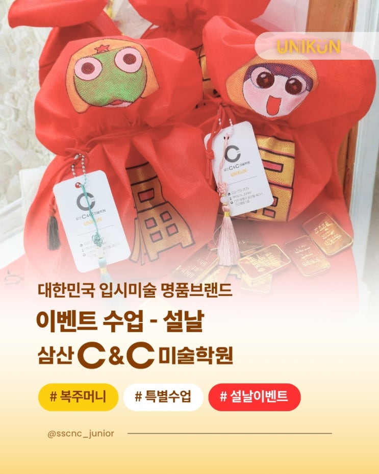 안녕하세요, #씨앤씨미술학원 삼산캠퍼스 UNIKUN 클래스입니다. 다음주면 벌써 설날을 앞두고 있어요. 설날 연휴 잘 보내시고, 새해에도 건강과 행복이 가득하시길 바랍니다 :) 설날 이벤트 수업 | 복주머니 만들기 2026 설날을 맞아 C&C미술학원 삼산캠퍼스 유니쿤 클래스에서는 복주머니 만들기 이벤트 수업을 준비했어요 수업 운영 방식 사고력과 집중력이 필요한 수업을 이어가다 보면 잠깐 리프레시가 필요한 순간이 와요! 이때 우리 유니쿤 클래스 친구들이 미술의 즐거움과 흥미를 되찾고 다시 수업에 몰입할 수 있도록 특별하게 준비한 시간이에요 이벤트 수업 구성 친구들이 조금 더 편안한 마음으로 미술을 즐길 수....... <img src="https://blogthumb.pstatic.net/MjAyNjAyMTFfMjQz/MDAxNzcwODA4NTU1MjMy.vkvK0a1ZmNsgqUaOOvXVvrwGbcIGedfWfzezD8RARaAg.4n83gb4spISuJSpfUWQPhS70-jN9DpK1KlVweZMqHskg.JPEG/1.jpg?type=s3" />