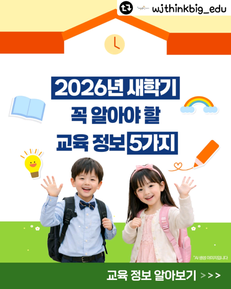 아이를 키우는 부모님이라면 새학기 달라지는 교육 정책, 미리 알고 준비하셔야죠? 2026년부터 달라지거나 새롭게 시행되는 주요 교육 정책을 한눈에 정리해 드려요 하나~ 초3 방과후 프로그램 이용권 신규 지원합ㄴㅣ다 방과후 프로그램 참여를 희망하는 초3 학생대으로 지원하니 서둘러 꼭 신청하세요~ 연간 50만원 내외의 '방과후 프로그램 이용권' 을 지급합니다. 둘 ~ 학생맞춤 통합지원을 시행합니다. 기초학력 진단과 학습을 한곳에서! 국가기초학력지원포털 개통으로 한눈에 볼 수 있습니다. 초1부터 고2까지 기초 학력진단과 심리검사, 맞춤형 학습을 할 수 있는 국가기초학력지원포털이 개통 운영됩니다. 셋~ 새학기 초등학....... <img src="https://blogthumb.pstatic.net/MjAyNjAzMTFfMzUg/MDAxNzczMjExOTgyMjg1.otmTV9fDOqExFK_-cwcVu393ks7dgfMhKO-IwfIyS2Ag.mXWDiLN395PsxQCshU1mS4ZxKq9QpzCwZcc8IgNde1wg.PNG/900%A3%DFDVQZYGwAeeN%A3%DF5_%A3%A83%A3%A9.png?type=s3" />