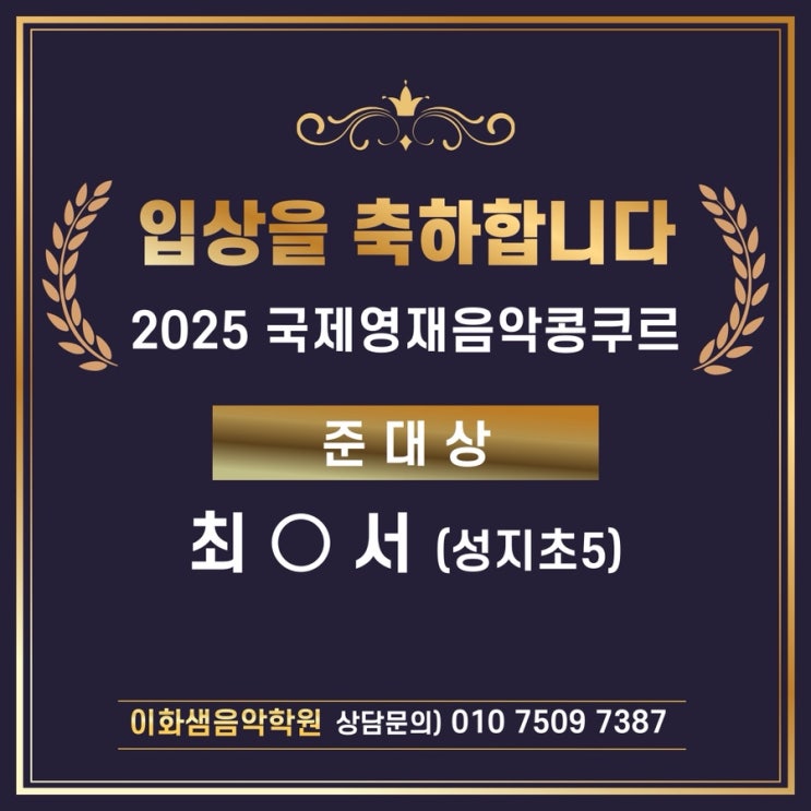 안녕하세요! 이화샘음악학원 콩쿨 입상 소식입니다~~✨ 2025.11.15에 열린 국제영재음악콩쿠르에서 멋지게 준대상을 입상하였습니다! 매일 꾸준히 연습하며 실력을 다져온 노력이 결실을 맺은 순간이라 학생도, 선생님들도 매우 뿌듯하고 기쁜 마음입니다 앞으로도 아이들이 음악 속에서 자신감과 즐거움을 쌓아갈 수 있도록 더 좋은 교육으로 함께하겠습니다 다시한번 진심으로 축하합니다 <img src="https://blogthumb.pstatic.net/MjAyNTExMjZfMjQx/MDAxNzY0MTMwMjcyOTg3._FyINA7kt5TOLkL1MNECAmGOLQuuZP9UlQAYgGai7c0g.9tADHkrJ1Ac76vdqmc5rhMAYytMvztrKhQX5Jm3YqoEg.JPEG/IMG%A3%DF3894.JPG?type=s3" />