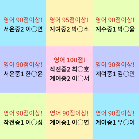 안녕하세요! 유클리드왕수학SKY영어학원입니다! 2학기는 늘~ 시험 대비하다 보면 정신없이 지나가는 것 같아요 이제야 올려보는 중간고사 결과입니다! 이번에 좋은 성적을 받은 친구들이 너~무 많아서 90점 이상만 이름을 올릴 수 있는 게시판이 폭발할 지경이었다는 건 안 비밀! 우선 영어 시험 잘 본 친구들입니다!! 특히, 첫 시험인데도 침착하게 시험 본 중학교 1학년 친구들 모두 칭찬해!! 그리고 고등부 영어 1등급을 받은 친구도 있답니다!! 늘 열심히 하는 모습이 멋진 친구예요! 이제 수학 시험을 잘 본 친구들도 볼까요?? 당당하게 이름을 올린 친구들 모두 평소에 꾸준히 공부하는 멋진 친구들이랍니다!! 중3 친구들도 마지막 시험을....... <img src="https://blogthumb.pstatic.net/MjAyNTExMzBfNzkg/MDAxNzY0NDc2ODEyNzI4.iT1saWyg9vnNk3hc82tkPfi-t4NT4p4694k-XjmTF6Qg.t3IgWqGugGwdJtoT_jWYBlBsgZBBgRUEbKMe_zLA8_gg.PNG/550%A3%DF%C1%A6%B8%F1_%BE%F8%C0%BD_%A3%A812%A3%A9.png?type=s3" />