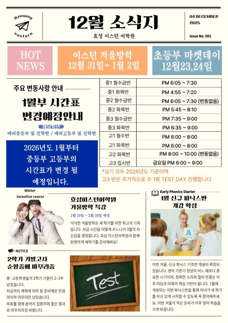 [효성동 영어학원] [Issue No. 001] 효성이스턴 어학원 12월 소식지 (이스턴 어학원 겨울방학, 마켓데이, 시간표 변경, 겨울방학 특강예정, 신규 파닉스반 안내)