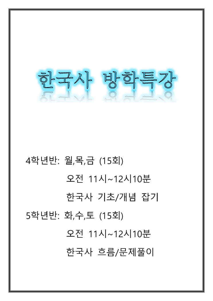안녕하세요~ 대교 하이캠퍼스 부흥학원입니다~ 짧은 여름방학이 지나고 긴 겨울방학이 곧 시작됩니다! 방학을 알차게 보내고 싶은 학생들을 위해 하이캠퍼스 부흥학원에서는 한국사 방학특강을 준비했어요! 한국사에 대한 기초지식이 없는 현재 초등 4학년반과 한국사에 대해 학교 수업을 들은 바 있는 현재 초등 5학년반으로 나누어 특강이 진행됩니다~ 방학동안 한국사 기초와 흐름을 꽉 잡고 싶다면 지금 바로 문의주세요~!! <img src="https://blogthumb.pstatic.net/MjAyNTEyMDlfMjk4/MDAxNzY1MjY3MTA4MzQ5.xGFvhp0-RDNq6YMN_nchNSCj4ErKCkLQvw-s-ZAxCKAg.ZA2Quu3bOROAf2u5lRCc0Ko4Zvw-_FviOSfhf88nzq0g.JPEG/%C7%D1%B1%B9%BB%E7_%C6%AF%B0%AD_%C6%E4%C0%CC%C1%F6_1.jpg?type=s3" />