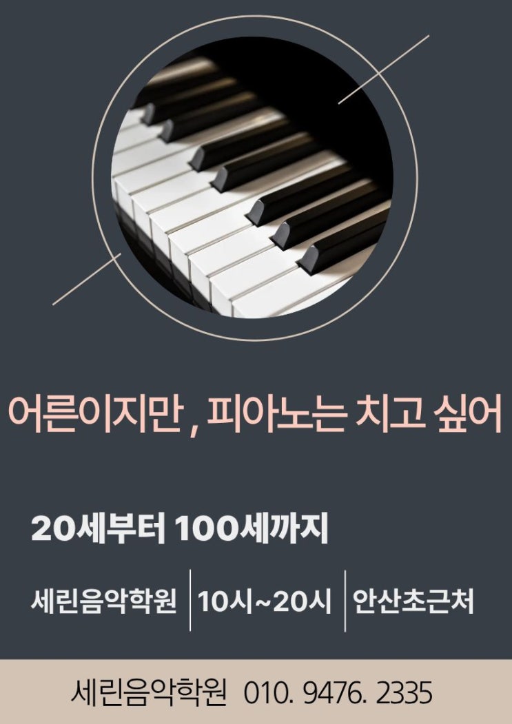 세린피아노학원에서 성인 피아노반을 새롭게 모집합니다. “어릴 때 배워보고 싶었는데…” “피아노 소리를 들으면 아직도 설렌다…” 이런 마음을 가지고 계셨다면 지금이 시작하기 가장 좋은 순간입니다. 세린피아노학원의 성인 피아노 수업은 20세부터 100세까지 누구나 편안하게 배울 수 있는 맞춤형 레슨으로 진행됩니다. 처음 피아노를 접하시는 분들도 부담 없이 시작할 수 있도록 기초부터 차근차근 지도해 드리며, 악보 읽는 방법부터 손가락 연습, 좋아하는 곡 연주까지 단계적으로 배울 수 있습니다. 예전에 피아노를 배우셨던 분들은 실력을 다시 살려 취미 연주곡이나 영화 OST, 클래식, 뉴에이지 등 원하는 곡을 중심으로 수업을....... <img src="https://blogthumb.pstatic.net/MjAyNjAzMTZfMjk5/MDAxNzczNjM3MTA2NzQw.lgPkyGKTN8FebPWg2uUOlHH5rzxZMWcCuPhLau5dkzAg.xEmPjEk6VefIJq731jjeYeJeY0xRJvlPHq8Svn2LGpIg.JPEG/%BC%BA%C0%CE%C8%AB%BA%B8.jpg?type=s3" />