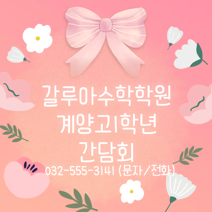 안녕하세요? 인천 계양구 계양고 학원 갈루아 입니다. 지난 2월 28일 토요일 오후, 갈루아수학학원에서는 계양고등학교 1학년 진학을 앞둔 학생들과 학부모님들을 대상으로 간담회를 진행했습니다. 고등학교 진학을 앞둔 시기는 학생들에게도, 학부모님들에게도 많은 변화와 고민이 시작되는 시기입니다. 중학교와는 학습 방식과 평가 방식이 크게 달라지기 때문에 미리 정보를 알고 준비하는 것이 매우 중요합니다. 이러한 부분에 도움을 드리고자 이번 간담회를 준비하게 되었습니다. 이번 간담회에는 계양고등학교 진학을 앞둔 학생들과 학부모님들께서 참석해 주셨으며, 학교 생활 전반과 내신 대비 방법에 대해 설명드리는 시간을 가졌습니....... <img src="https://blogthumb.pstatic.net/MjAyNjAzMDhfMTc4/MDAxNzcyODk2NTA1NzEx.Afkg-acAJOczVqFyBzMUCRmk2BWSwtNfJM829jsk0y4g.vTBww6noMKgnd1pxweODmbeR1sJXJW3b2_WXzeGb-swg.PNG/image.png?type=s3" />
