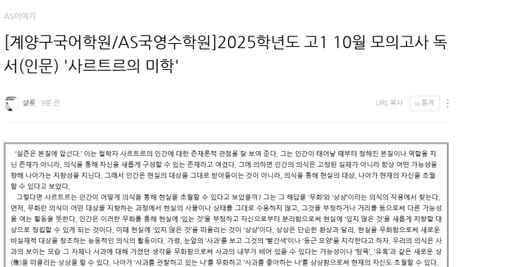 [계양구국어학원/AS국영수학원]2025학년도 고1 10월 모의고사 독서(인문) '사르트르의 미학'