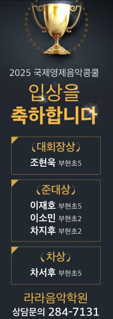 4개월동안 열심히 준해해서 나간 우리 라라 친구들 첫콩쿨~!! 떨리는 마음으로 첫 출전한 국제영재음악콩쿨에서 우수한 성적으로 전원입상이라는 쾌거를 거뒀습니다~!! 쑥쓰러운 우리 친구들~~♡♡ 멋진 5학년 삼총사들~~~♡♡ 전원 우수한 성적으로 입상~!!!♡♡♡ 첫콩쿨이후 다시한번 또 도전해 보고싶다는 기특한 라라친구들~ 힘든 연습기간에도 잘 따라와준 너희들이 쌤은 넘넘 기특하고 고맙단다~~♡ 우리 내년에도 다시한번 도전~~해보자!! 상담문의 01082397132 <img src="https://blogthumb.pstatic.net/MjAyNTEyMDRfNDUg/MDAxNzY0ODM4MjY3NzEx.FDAg666ervcCdv28ZC4FiGlJQ-vkorCBhD_FC5ZzYq4g.8sxm8S8gdj_pPoT5WSrU4EMlogwFLUXM6DeK2eLpi90g.JPEG/1764837432281.jpg?type=s3" />