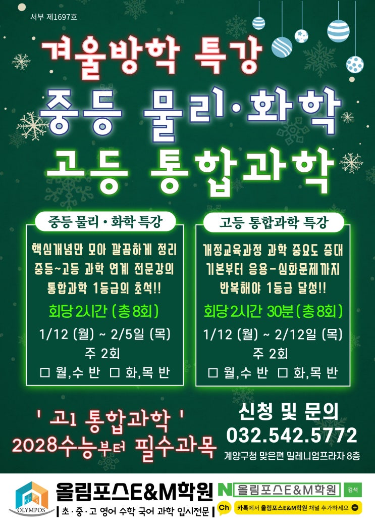 ☆★겨울방학 과학특강★☆ § 중등 물리+화학 / 고등 통합과학 § ▶ 중등 물리+화학 ◀ 핵심개념만 모아 깔끔하게 정리 중등∼고등 과학 연계 전문강의 통합과학 1등급의 초석!! -1/12(월) ~ 2/5(목) -주2회 (월수반 or 화목반) -회당 2시간, 총 8회 ▶ 고등 통합과학 ◀ 개정교육과정 과학 중요도 증대 기본부터 응용-심화문제까지 반복해야 1등급 달성!! -1/12(월) ~ 2/12(목) -주2회 (월수반 or 화목반) -회당 2시간 30분, 총 8회 #수강 및 상담문의 ☎032542577 반드시 해답을 찾는 올림포스E&M 상담문의: 032.542.5772 #계양구 #계양구학원 #계양구청학원 #서운고 #작전고 #작전여고 #계양고 #계산여고 #계수중 #계산중 #계산여중 #고....... <img src="https://blogthumb.pstatic.net/MjAyNTEyMDlfMTUx/MDAxNzY1Mjg3ODU4MzY4.ovS6j8rIAYa3Aw4Kz-Zt5Zm7YPLhS2N-3bVtlVGMcw8g.NngNITmfHB5QgFqc3qz3_GPFcgWaBkMipOGqUa4K3sgg.JPEG/1208.jpg?type=s3" />