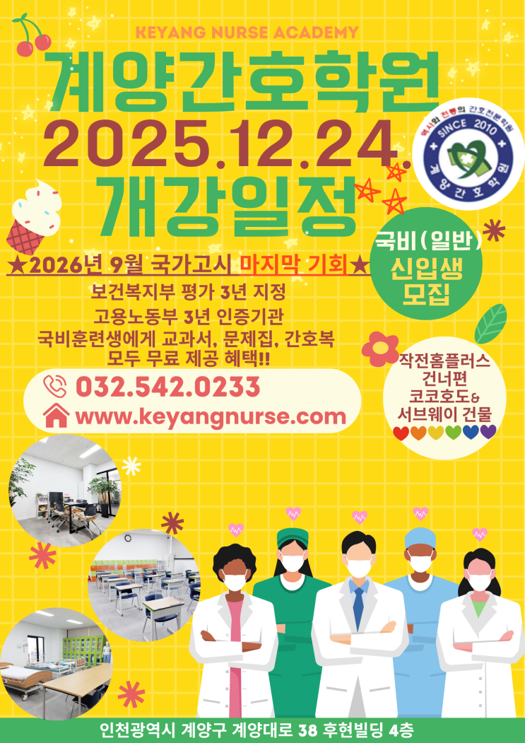안녕하세요! 계양간호학원입니다! 어느덧 2025년도 달력도 두장밖에 안남았네요~~ 2025년도 어떤 추억들이 있으셨을지 궁금합니다! 저희 계양간호학원에서는 가을학기 개강 9월 15일 개강을 시작으로 최근 11월 12일 개강까지 많은 분들의 성원에 힘입어 무사히 개강을 할 수 있었던 점에 대해 진심으로 감사드립니다!! 2026년 9월 간호조무사 국가고시 대비할 수 있는 마지막 기회가 될 2025년 12월 24일 개강반에 대해 안내드리려 합니다 ^^ 벌써부터 많은 문의가 있으니 관심있으셨던 분들은 꼭! 이번 기회를 잡으시길 바랍니닷!!!! 친절히 상담 드릴테니 꼭 문의 부탁드려요~~~~ 저희 계양간호학원 일명 작전점은 작전홈플러스 건너편! 정확....... <img src="https://blogthumb.pstatic.net/MjAyNTExMThfOTkg/MDAxNzYzNDQ4ODA1MTM5.3AxQ9FGZAfgrwqKgZzDMVM6erkMz1KQRFSDKO3MT2P4g.Ekb6tfuOTVTLeea4nlmKG0R3op4Nw8EvJEcV8P17LdIg.PNG/%B0%E8%BE%E7%B0%A3%C8%A3%C7%D0%BF%F8_%2825%29.png?type=s3" />