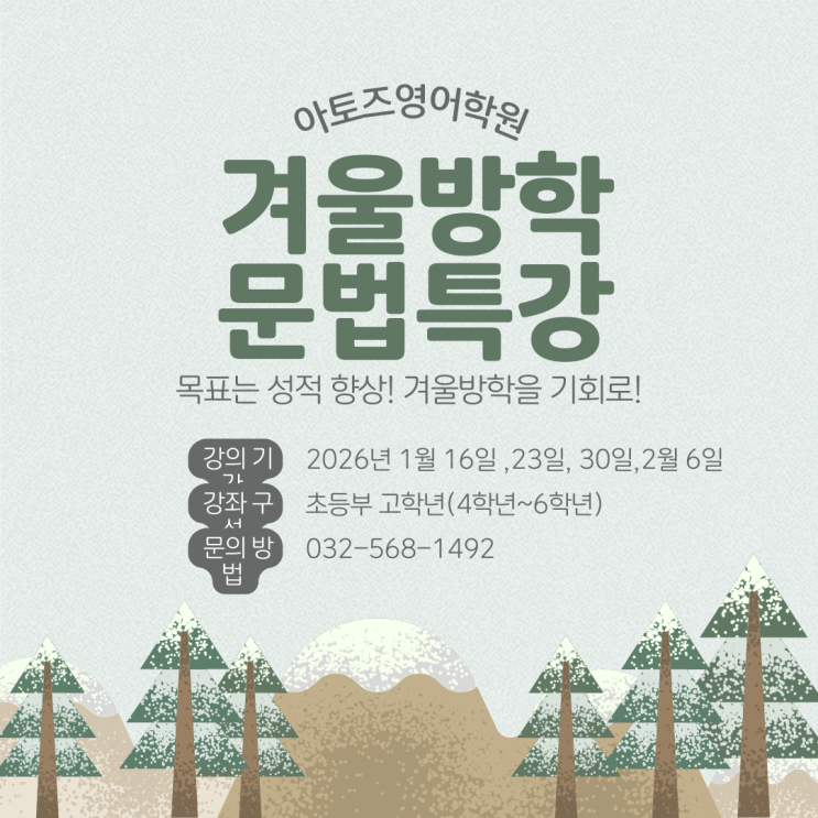 아토즈영어학원 아토즈영어학원 겨울방학 초등 영어문법 특강안내 안녕하세요. 아토즈영어학원입니다. 겨울방학을 맞아 초등영어문법 원장 직강 재원생 무료특강을 개설합니다. 이번 특강은 2월7일 '국제표준인증 시험 캠브리지테스트'를 위해 기초 문법을 체계적으로 정리하고, 초등학교 영어 그리고 중등 내신의 기반이 되는 핵심 문법을 확실하게 잡아주는 프로그램입니다. ●특강대상 ·초등4-6학년 ·영어문법 기초를 다지고 싶은 재원생 ·문장만들기와 독해 실력을 함께 키우고 싶은 학생 ●특강일정 ·1월 16일,23일,30일,2월6일 ·오전 10시~오후1시 ●수업내용 ·품사이해 (명사, 동사,형용사,부사등) ·시제정리(현재, 과거, 미래....... <img src="https://blogthumb.pstatic.net/MjAyNjAxMDdfMjA4/MDAxNzY3NzcxNjk2NDU3.i-FrLDUvXhsA2CvpFkii1et6ZpE5XlZTJ3_Ozl1GZ7Mg.vdUVzcGW6_dhzohW0qN7PhtBiqmUXQxFj-xc6p4VH54g.PNG/%C8%B8%BB%F6_%C3%CA%B7%CF%BB%F6_%B1%F2%B2%FB%C7%D1_%B0%DC%BF%EF_%B9%E6%C7%D0_%C6%AF%B0%AD_%C8%AB%BA%B8_%C0%CE%BD%BA%C5%B8%B1%D7%B7%A5_post.png?type=s3" />