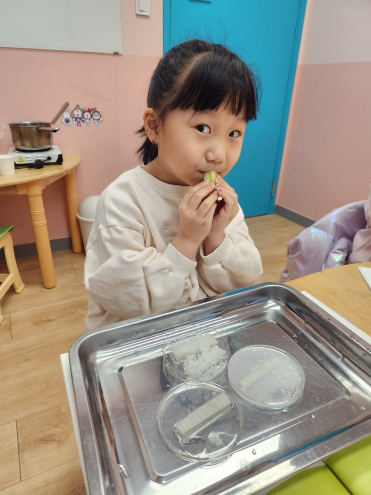 귀염둥이 7세 친구들 이번주는 오랫동안 저장할 수 있는 음식에 대해 탐구해보았어요. ▶무를 소금물과 물에 담가 보고 소금물에 넣은 무가 말랑해진 이유를 추리해 보았어요. ▶무에 직접 소금을 뿌려 보면서 무에서 물이 빠져나왔음을 알게 되었어요. ▶소금 외에 무를 말랑하게 할 수 있는 재료를 실험을 통해 찾아보고 이를 이용하여 무와 오이 피클을 만들어 피클이 2~3일 후에 변화될 모습을 예상해 보았어요. ☑언어활동 유전자 재조합으로 만든 식물을 관찰하고, 직접 채소를 합쳐 새로운 식물을 만들어 보았어요.유아는 합쳐진 채소의 좋은 점을 이야기하고, 자신이 만든 채소를 소개하면서 자신의 생각을 구체적으로 표현해보았어요. ♥....... <img src="https://blogthumb.pstatic.net/MjAyNjAxMDhfMTEx/MDAxNzY3ODY1Mzg0NjM1.M8Y1vA2lxW5mSCE0rtOqlg-a4fcS9vP3FgYyaGoSOOUg.EW4fV6WT33XTSnyr48VhcZWFTjM-J9-P0uTV36Z4ctQg.JPEG/1767409577280.jpg?type=s3" />