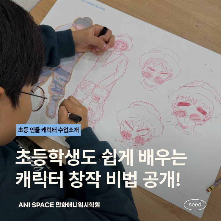 안녕하세요☺️ 애니스페이스 씨드반 수업소개로 인사드립니다! 사람 그리기를 어려워하는 초등학생 친구들이 많다는 점!! 저도 잘 알고 있습니다. 처음에 어떻게 그릴지 막막할 때도 많고, 완성한 그림이 마음에 안 들어서 고민하는 경험도 흔히 하게 되죠‼️ 저희 애니스페이스 만화학원 씨드반에서는 그런 걱정을 덜고 모두가 쉽게 배우고 그릴 수 있는 시간을 가져보았습니다.✨ 얼굴과 인체 비율, 포즈, 표정까지 아우르는 수업으로, 재미있고 효과적으로 인체 그리기를 배워보는 기회입니다. 이제 그 수업의 비법을 소개해 드리려고 합니다! 사람을 잘 그리고 싶고, 인체를 잘 그리고 싶은 친구들은 모두 집중해서 봐주세요!?....... <img src="https://blogthumb.pstatic.net/MjAyNjAxMTJfMjk3/MDAxNzY4MjAyMDY3MTM5.TwtX-_I2gmf75nf82qwctZMwezvy-4mOxnEJm1421wYg.mdqUAE07cNUHFZomyU9xw8-By6OkjLMJcKqYJedhGjAg.JPEG/%C4%B3%B8%AF%C5%CD_%C3%A2%C0%DB.jpg?type=s3" />