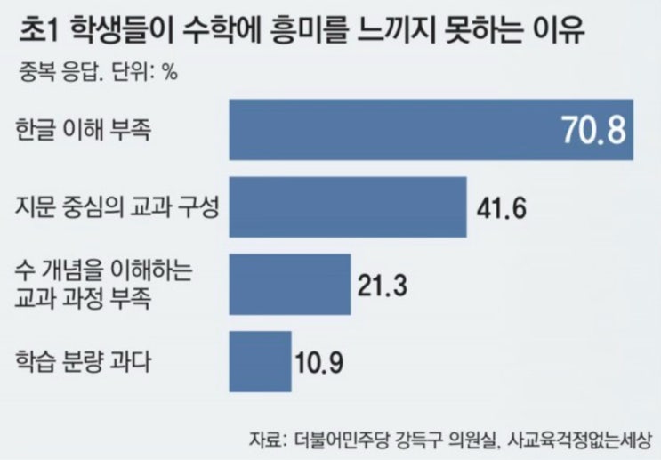 초등학교 1학년생 5명 중 1명은 수학에 흥미를 못 느끼고, 4명 중 1명은 문제 풀이를 지레 포기하는 것으로 나타남. 어려운 수학 교과서가 ‘초1 수학 포기자’를 만든다. 초1 19% ”잠재적 수학 포기자” 학교 현장에선 "수학 교과서가 어렵다 ”는 지적이 많다. 수학을 처음 접하는 초1 교과서가 연산을 학습했거나 한글을 뗀 아이를 기준으로 집필. 수 개념을 익히는 과정은 압축되어 있는 반면 스토리텔링식으로 설명 하다보니 문해력이 있어야만 풀 수 있는 문제 유형이 대부분 !! 리딩앤써는 서술형 평가 시대에서 필요한 비문학 독해 지문으로 분석 ! 훈련을 통한 문장해석 ! 짧은글을 정확하게 읽어 습득하는 프로그램입니다. 꼼꼼한 7단....... <img src="https://blogthumb.pstatic.net/MjAyNTExMTRfNTYg/MDAxNzYzMTA0MzY2MTYz.Uzzl9Jf5SbVZL6ml1ITbX6y_XNMf_k2cinsgO2Fxtfog.On1_q9ylvIjnOQ_8ym1Xy5810imoHqv4xFpG5MQ9MxQg.JPEG/random%A3%DF45BB92A6%A3%AD8D1E%A3%AD43B7%A3%ADAF0F%A3%AD568731E132DD.jpg?type=s3" />
