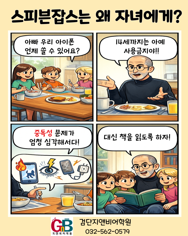 스티븐잡스는 왜 자녀에게 아이폰사용을 제한했을까요? ✔️스마트폰을 세상에 내놓아 큰돈과 명예를 얻은 스티브 잡스. 아이러니하게 자신의 자녀들에게는 스마트기기 사용을 엄격하게 통제했다고 합니다. ✅️14세까지는 아예 사용을 금지했고, 그 이후에도 사용 시간을 철저하게 제한했다는 사실...⏲ 빌 게이츠, 저커버그, 팀 쿡 등 미국 IT업계의 CEO들 역시 스마트기기와 SNS로부터 어린 자녀를 멀리하게 한다는데! ✅️중독성 문제. SNS의 숏폼 영상을 한 번 보기 시작하면 어느덧 한두 시간이 흐르는 경험은 어른들도 시간 통제하기 어려운게 현실... ✅️ 과도한 사용은 집중력과 자기 조절력을 상실된다고 하....... <img src="https://blogthumb.pstatic.net/MjAyNTExMjVfMTgx/MDAxNzY0MDM4NzAxODQ2.00LZSB2B7XGD-EO5tzwi1PQ7mywT6iHjJgrIMmAmQBsg.nQ0Mp_akO4sPe6RofDrKuP6V68giBT45NAoGneZri8Ag.PNG/%BD%BA%C6%BC%BA%EC%C0%E2%BD%BA_%B0%CB%B4%DC%C4%B7%C6%DB%BD%BA.png?type=s3" />