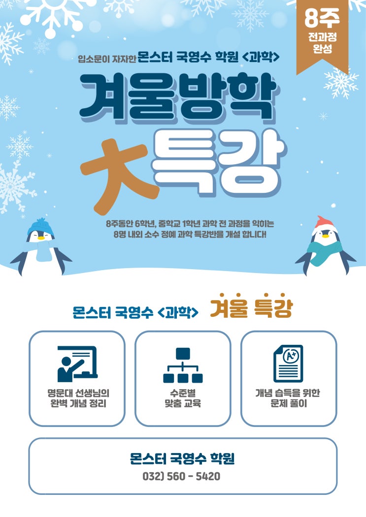 몬스터 국영수 학원에서 6학년 과학 전과정 중학교 1학년 과학 전과정 과학 특강반을 개설합니다! 안녕하세요. 초등, 중등, 고등 특목고, 해외 대학 입시 전문 청라 수학 영어 학원 몬스터 국영수입니다. 오늘은 청라 학원 몬스터 새 학기 준비! <과학 특강반> 개설 소식을 전해 드려요~ 청라 학원 몬스터 국영수 과학 특강반 수업 과정 몬스터 국영수 학원의 “새 학기 준비 8주 완성” 과학 특강은 초등 5학년 -6학년 과정 전과정 초등 6학년 -중학교 1학년 전과정을 학습하는 과정으로 진행됩니다. 수업 인원과 수업 요일 수업 인원은 각 학년별 8명 내외로 진행되는데요! 많지....... <img src="https://blogthumb.pstatic.net/MjAyNTEyMDdfNzgg/MDAxNzY1MDg3OTQ3NjU2.QPL5N-9mJfD3dq3jwkNyqBTCg005gSKWTRX5YPBFaikg.r1nN63Rr-SxJ7c-TIYeJ6ov8n32SEvYKzA6lvEayGNcg.JPEG/%C1%A6%B8%F1%C0%BB_%C0%D4%B7%C2%C7%D8%C1%D6%BC%BC%BF%E4.jpg?type=s3" />