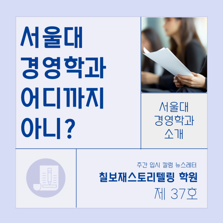 [서부 제2448호] 안녕하세요 칠보재입니다 대한민국 경영학의 중심, 바로 서울대학교 경영학과(설경)입니다. 오늘은 입시생의 시선부터 실제 대학생의 경험까지, 서울대 경영학과의 현실적인 이야기를 정리했습니다. 막연한 환상이 아닌, 진짜 ‘설경의 하루’를 알고 싶다면 끝까지 읽어보세요! 서울대학교 경영학과는 논리적 사고력과 협업 중심의 실무형 인재를 길러내는 곳입니다. 경제학보다 현실에 가깝고, 문과 중에서도 취업과 진로의 폭이 넓은 학과로 평가받습니다. 수학적 감각과 비즈니스 감각을 함께 갖춘 학생이라면, ‘설경’은 최고의 선택이 될 것입니다. 서울대 경영학과 소개 칼럼 보러가기 https://blog.naver....... <img src="https://blogthumb.pstatic.net/MjAyNTExMjJfNzIg/MDAxNzYzNzk2NDQ3OTY4.OJ2FYKGHjM3AUk77EI8Y1hnZXr0PQIs4qWgG346tunIg.hTYil8TateZE3GGIOpNu6yAmgsZu_P5e4nRlgoLpcDwg.PNG/001.png?type=s3" />