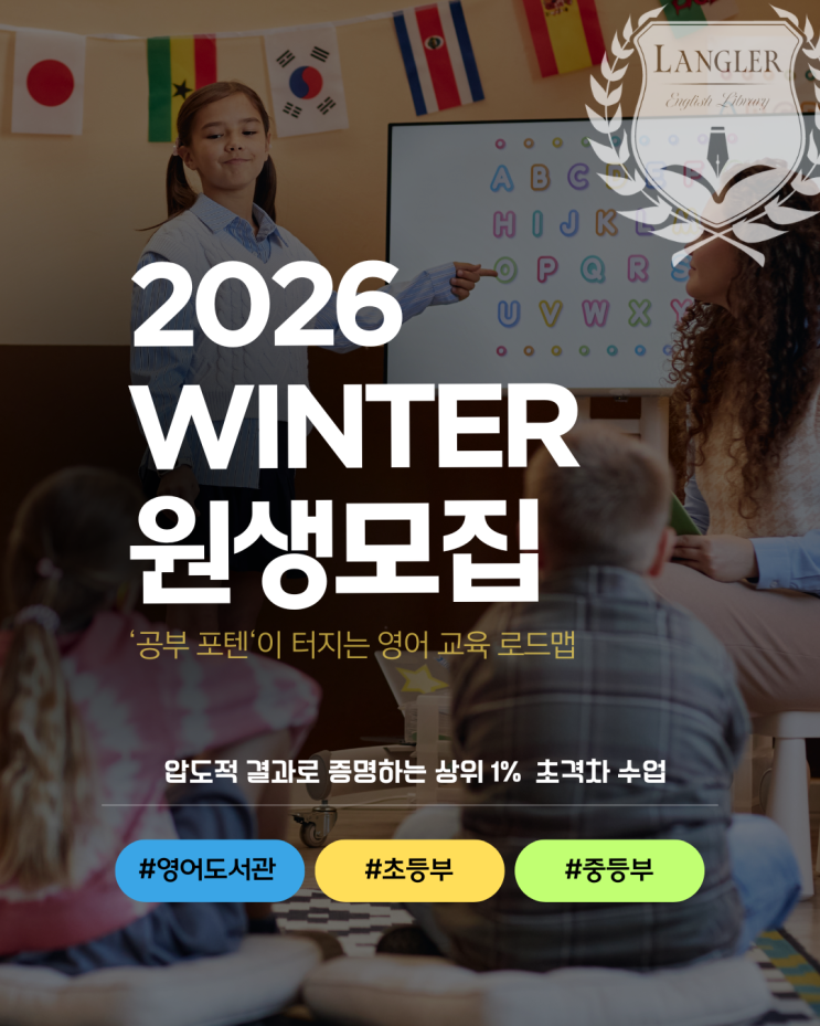 안녕하세요. 랭글러입니다. 겨울방학을 준비해야하는 시점, 새로운 학원을 찾고 계신가요? 랭글러는 아이의 실력에 알맞은 학습 솔루션 제시를 위해 다양한 프로그램을 갖추고 있습니다. 획일적인 교육이 아닌 내 아이에게 딱! 필요한, 적기 교육을 경험해보세요. 학원을 바꾸면, 아이가 달라집니다. ■ 영어 노출 극대화, 영어도서관 ♪ 파닉스부터 해리포터까지 ♪ 영어로 질문하고 대답하는 BookTalk ♪ 바로 쓰고 바로 첨삭받는 Writing Time ♪ 불필요한 태블릿 사용 ZERO ♪ 많이 읽고, 많이 말하고, 많이 쓰는 본질에 집중하는 원서수업 ■ 초등부 정규어학원 과정 ♪ 레벨에 따른 원어민교사-이중언어교사 수업 ♪ Spring-Summer-Fall-Wi....... <img src="https://blogthumb.pstatic.net/MjAyNTEyMDNfMjAg/MDAxNzY0NzYwNDE0MTQ3.9f4PpOOgLYFNRgr1USTvZoC6SkIPmJ1IvOv2jRXBwREg.yUkUVyz2HfIZMebVf4CBxWaSHTFJzrc5iZ9996WQCr8g.PNG/%C8%AB%BA%B8.png?type=s3" />