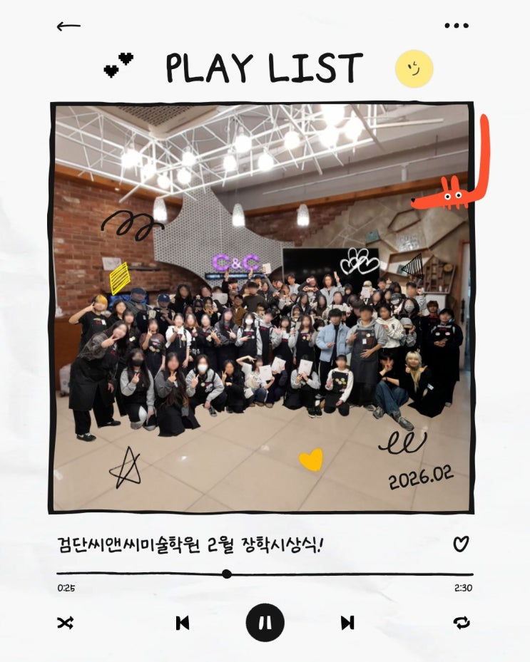 안녕하세요~ 인천 서구 검단신도시 검단미술학원 검단C&C미술학원 단이입니다! 오늘은 장학시상식에 대해 소개하고자 합니다. 검단씨앤씨 미술학원에서는 매달 장학시상식이 진행되고 있는데요. 장학시상식이란~~~? 지각 결석하지 않은 모범적인 학생! 한달동안 실기력이 많이 상승한 학생! 친구에게 검단씨앤씨미술학원을 소개한 공로장학생 친구에게 검단씨앤씨미술학원을 소개받은 추천장학생 을 선정하는 장학시상 행사입니다 그럼 2월 장학시상식을 함께 보실까요~? 지각 결석 없이 성실히 임해준 검단씨앤씨 학생들 모두 수상 축하드립니다!! 다음달에도 수상의 영광을 누릴 수 있도록 성실하게 입시생활 합시다 검단씨앤....... <img src="https://blogthumb.pstatic.net/MjAyNjAyMjFfMTQ3/MDAxNzcxNjM4Nzk2Nzc0.F-8b1fRIP5uA_SyPPJ49mTmG5q9c0VIrGE8nTEe7VPkg._5fLg7L808QIefiOmEuO3zeAnKsFG2ADAiu24TtqllEg.JPEG/1.jpg?type=s3" />