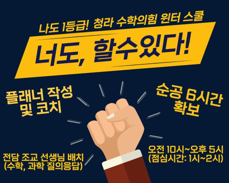 안녕하세요 수학의 힘 학원입니다! 어느새 한 해를 마무리하고 새로운 학기를 준비하는 겨울방학이 다가왔습니다. 방학은 길지만, 제대로 준비하지 않으면 금방 지나가 버리고 학습 격차가 벌어지는 시기이기도 하죠. 그래서 수학의 힘 학원에서는 학생들이 학습 리듬을 유지하고, 스스로 공부하는 힘을 기를 수 있도록 돕기 위해 올해도 특별한 겨울 프로그램, 윈터스쿨을 준비했습니다. 이번 겨울, 우리 아이가 한 단계 성장할 수 있도록 확실한 학습 루틴과 자기주도 습관을 만들어주세요! 플래너 작성 + 자기주도학습 역량 강화 프로그램 ✔ 1) 플래너 작성 지도 하루 목표 설정 시간 관리 및 우선순위 정하기 주간 피드백으로 계획 실천력 향....... <img src="https://blogthumb.pstatic.net/MjAyNTEyMDRfMTIw/MDAxNzY0ODMwODU2OTcy.unCPc5CcuIv4xfWgvKPFemwj3w2p5gUe6P8uQSQ0150g.91zwLqInhEMPhFur7B7tWqdc7xMsgT6UBu9OatwJxOcg.PNG/image.png?type=s3" />