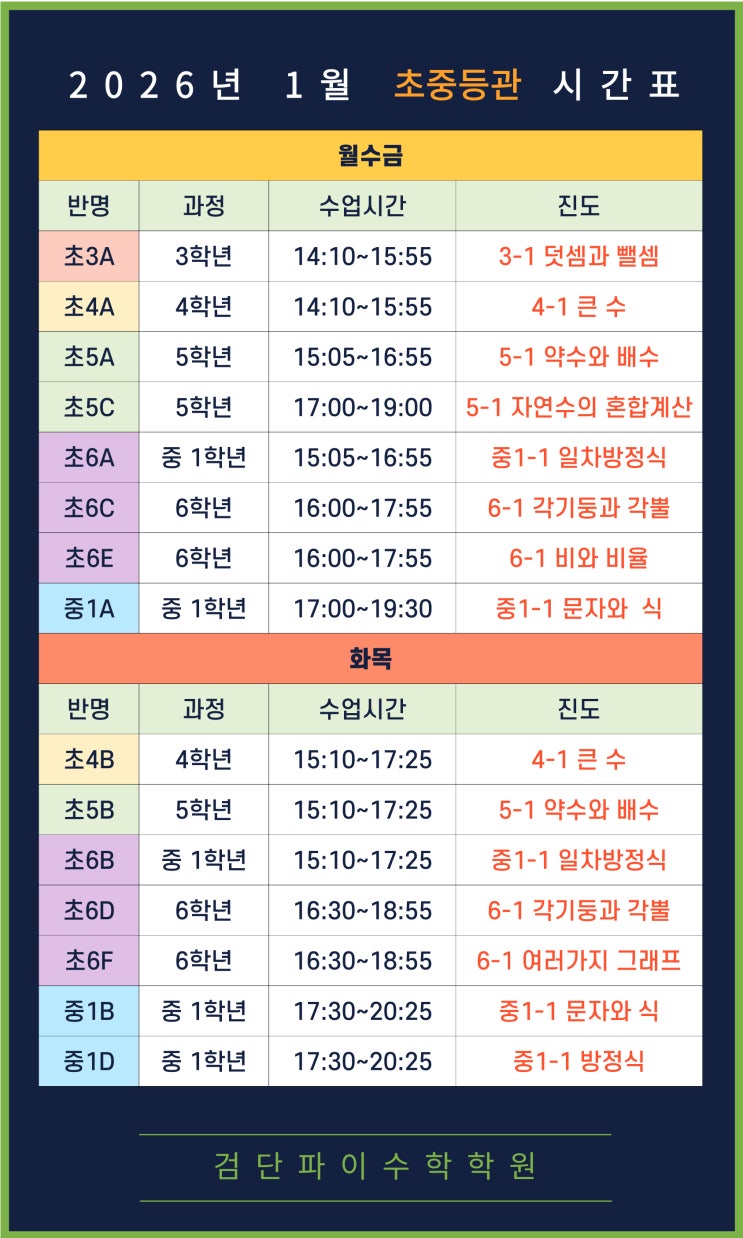 2026년 1월 시간표 안내드립니다 안녕하세요, 파이수학학원입니다. 항상 아이들의 학습에 관심 가져주시고 믿고 맡겨주셔서 진심으로 감사드립니다. 2025년 1월부터 일부 반의 수업 시간, 요일 및 담당 강사 변경이 예정되어 있습니다. 이번 조정은 학년 승급, 학습 진도 차이, 수업 운영 효율을 반영하여 이루어진 사항이오니 번거로우시더라도 해당 반 시간표를 꼭 확인 부탁드립니다. 변경 안내 사항 반별로 등원 시간, 수업 요일 및 담당 강사가 변경될 수 있습니다. 학년이 올라가는 학생은 승급에 따라 반 및 시간대가 달라질 수 있습니다. 일정 조정이 필요한 가정에서는 미리 연락 주시면 조정에 도움드릴 수 있습니다. ?....... <img src="https://blogthumb.pstatic.net/MjAyNTEyMDVfMjUy/MDAxNzY0OTMyNTYxMjIw.eS5ICtXtPwgthewmyda7ggUAvVbzvBecSWkFW4AsU-sg._P2j7_ZWxGxI5HlHVO9EOTahRwOHPCUzopWP66ljj_4g.JPEG/%C3%CA%B5%EE1%BF%F9%BD%C3%B0%A3%C7%A5.jpg?type=s3" />
